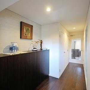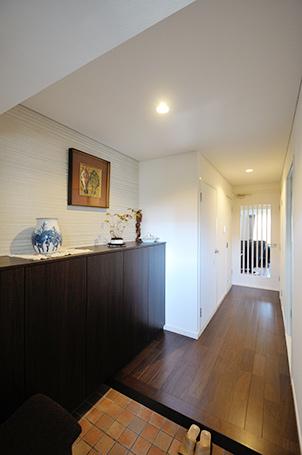 レンガ調からシックなグレーのクロスに替えた玄関ホール。玄関収納は横幅を広げることで容量はUPしつつも、圧迫感のない高さにしました。