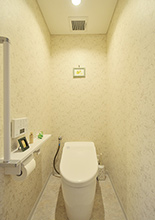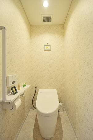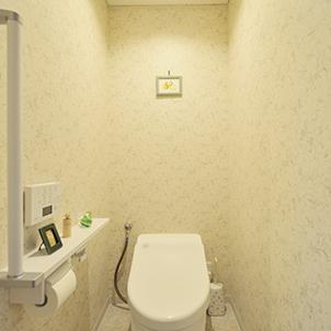 タンクレスの節水型便器とホワイト系の内装で、スッキリ清潔感がありと広がりを感じるトイレ。将来を考え手摺も取付けバリアフリーに。