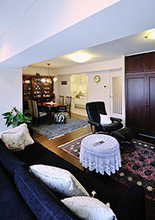 存在感のあるアンティーク家具に合わせて内装(壁・床)はシンプルにまとめました。 家具はバランスを考えて配し移動やすい動線に。