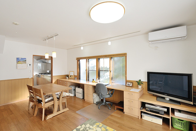 以前はパソコンまわりに本や物が溢れ、雑然としていたリビング・ダイニング。TVボードと一体になった壁面収納カウンターを造作して、スッキリとしました。カウンターはダイニングテーブルと高さを合わせてあるので、ベンチは1つ2役でどちらでもご使用いただけます。