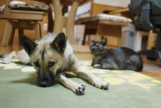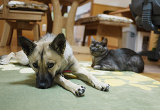床暖房を設置したリビングでは、愛犬ココちゃんと愛猫クーちゃんが仲良くゴロン。「床暖房は想像以上に快適です。とても暖かくなりました!」とY様も大満足。