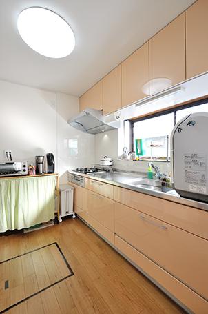 リビング・ダイニングの壁面収納カウンターと同色調で揃えたシステムキッチン。 背面は天井まである大容量のストッカーと冷蔵庫上の吊り戸収納を設置。