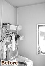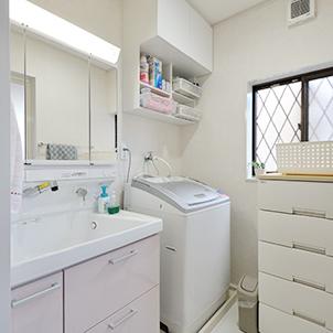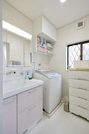洗面化粧台は収納力抜群のTOTOサクア。洗濯機上の収納は、「とても便利♪」と奥様に好評。