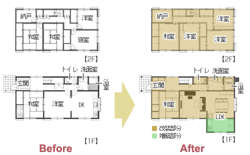 老後に備えてのリフォームでしたので、すべての段差を無くしドアも引戸へ変更するなどバリアフリー化。ご主人が以前から興味を持たれていたオール電化+太陽光発電に設置。住み慣れた間取りは大きく変更せず、増築することで快適なLDKを実現。すべての窓はペアガラス&二重サッシに替え、断熱性能を高めた省エネリフォームとなりました。