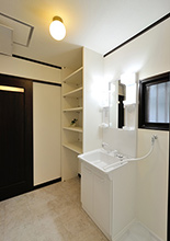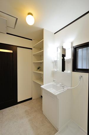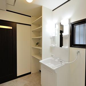 トイレをずらして広くなったスペースを利用してタオル類などが置ける棚を造作。洗面台も広くなり使いやすくなりました。