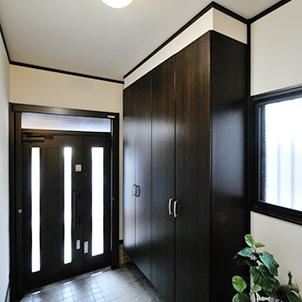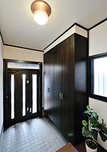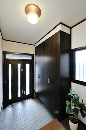 玄関ドアはスリットガラスで採光が採れ、網戸付きだから換気も可能に。大容量の玄関収納も設置。