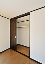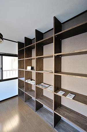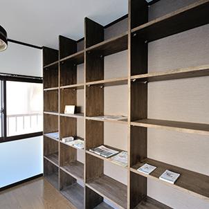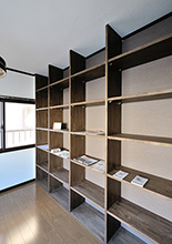 書斎にも書籍がたくさん収納できるようにリビング同様のオープンシェルフを造作。 押入れは3本シンクロ引き戸に変更。開口幅が大きく出し入れもしやすいです。