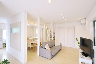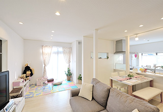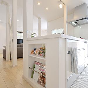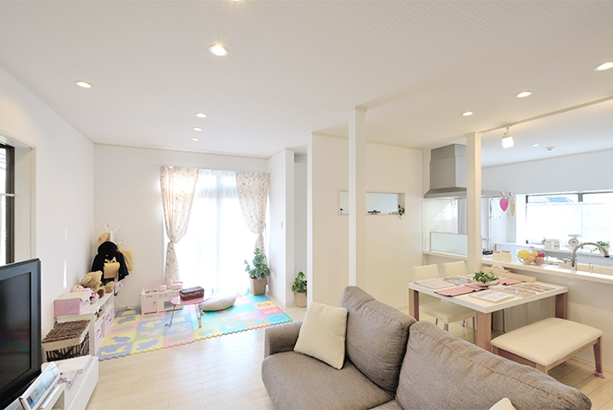 構造上抜けない多数の柱は白塗装でおしゃれにデザインし、囲まれたスペースは、動線への影響が少ないダイニングに。広々としたワンルームにもそれぞれの場の役割を持たせ、家事動線も考慮した子育てしやすい住まいとなりました。