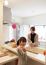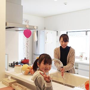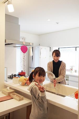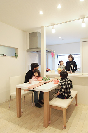 床暖房の暖かさで、ほっこり家族の笑顔いっぱいのダイニング!フラットタイプのキッチンカウンターだから、反対側からでもママのお手伝いがしやすい。