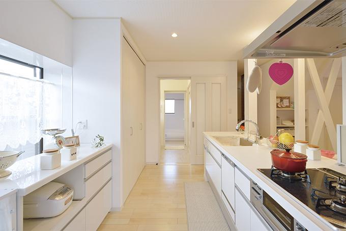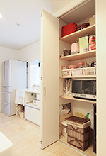 キッチン背面にはクローゼットタイプの大容量パントリー。電子レンジ他、ストック類など雑然とした物もスッキリ収納出来て、おしゃれなキッチンを可愛く保てます。