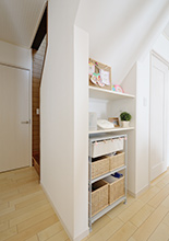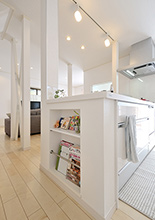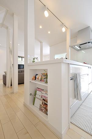 リビング階段下のニッチは、お子様の作品のディスプレイスペースに。 キッチンのエンドには人工大理石の天板を伸ばし、柱と同化させたマガジンラックを造作。