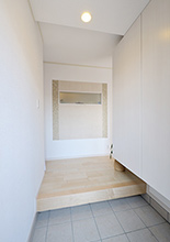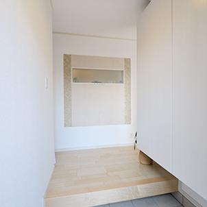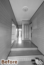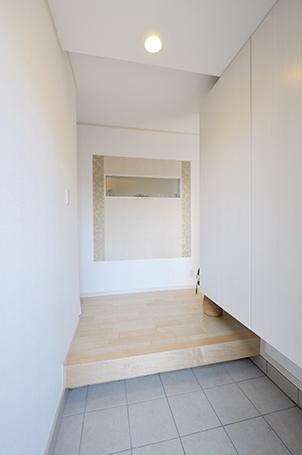 玄関を一坪増築し、LDKとの間には明かり採り窓のある壁を造作。左はキッチン、右はリビング&キッズコーナーへ。