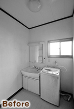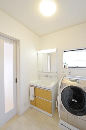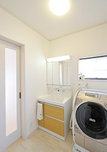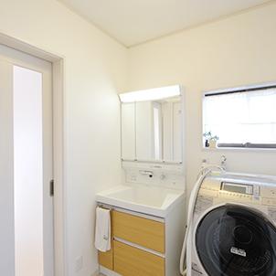 2方向から入れるようになった洗面室。キッチンと隣接しているから「お風呂上りの子供たちのお世話もしやすくなりました。」と奥様。