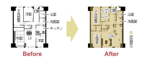 | リフォーム箇所 | リビング、ダイニング、キッチン、洗面、トイレ、浴室、廊下、玄関ホール、主寝室、子供部屋、ゲストルーム |