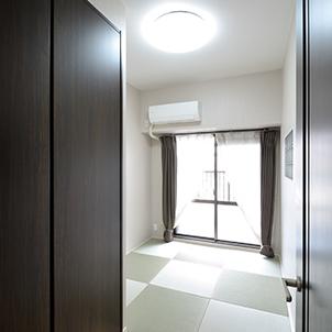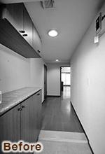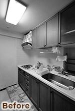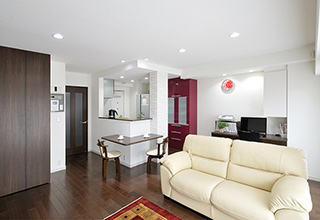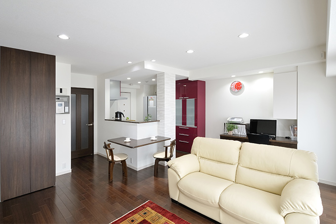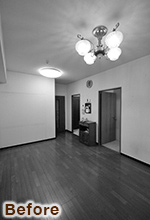 隣接する洋室&キッチンの壁を取り除き、オープンで明るく広いLDKへ。床材は適度なムラが楽しめ、高級感もあるブラックウォールナットでシックにまとめました。キッチン前に造作したダイニングカウンターで更にご家族のコミュニケーションも向上。照明器具はすべてLEDランプに取替え、光熱費用を節約!