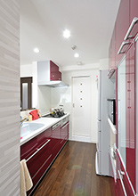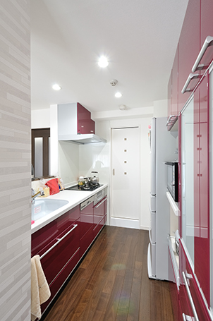 以前はリビングダイニングと分かれていて、家族と会話をしながらのお料理ができなかったキッチン。今は開放され「キッチンに立っていても家族や外の気配も感じるし、TVも見れます!」とT様。背面のたっぷり収納と、突き当りのドアからは洗面室へも通り抜けられてとても便利に。