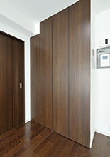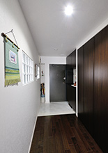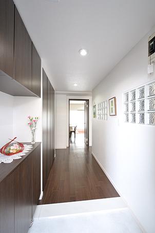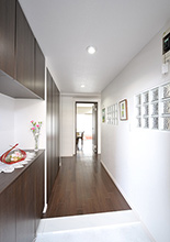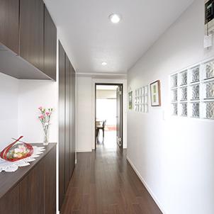 玄関と壁一面に収納を設けても広く感じる玄関は、ホール幅を40cm広げることで実現。隣接するゲストルームのガラスブロックから漏れる自然光で、明るくおしゃれな玄関ホールに大変身!