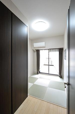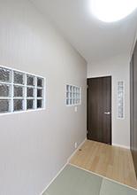 ガラスブロックと、縁なし畳で和モダンな雰囲気のゲストルーム。寝具もたっぷり入る収納付きなので、娘さん夫婦が遊びに来た時など重宝します。