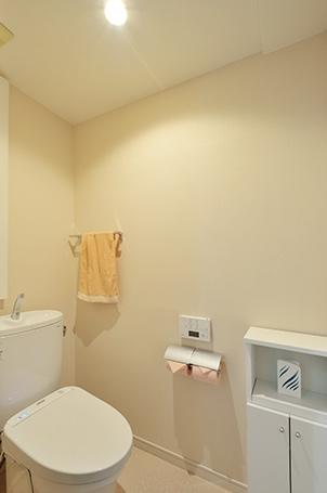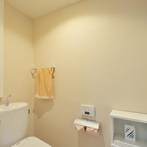 トイレは節水タイプのTOTOピュアレストEX。内装はダーク調とも相性の良い、ペールピンクの壁紙で優しくホッとする空間に。