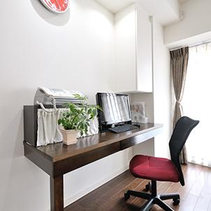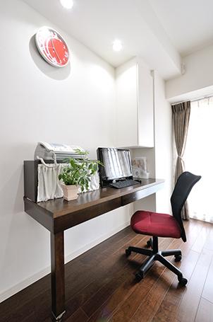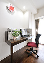 LDKの一角にPCコーナーを造作。細々したモノは吊り戸収納があるので隠せます。