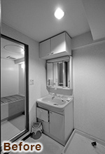 コンロから一歩で洗濯機前と、家事の移動が楽になった洗面室。化粧台はTOTOサクアを採用。
