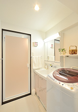 バスタオル掛け、洗濯機上部の洗剤置き場など、毎日繰り返し使用する物は、使いやすい高さにこだわった。