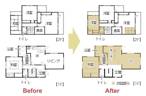| リフォーム箇所 | 1F(リビング、ダイニング、キッチン、洗面、浴室、廊下、玄関、和室)、2F(トイレ、洋室) |