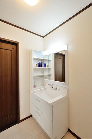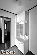 手が届かず使いにくかった吊戸収納を外し、洗面化粧台はLIXILピアラを設置。下部の引き出し収納は奥までたっぷり物が入るので、収納量は変わらずで使いやすくなりました。