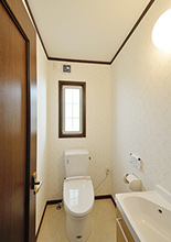 コンパクトながら掃除用具なども収納できる手洗いを新設。トイレはエコ仕様の節水型タイプに。