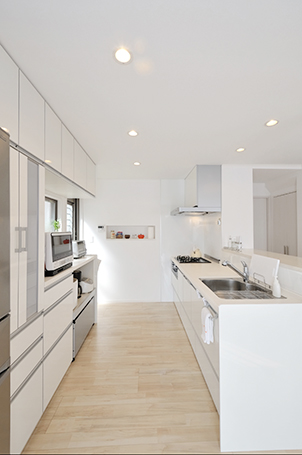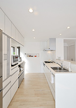 システムキッチン&収納はシンプルで明るいホワイトカラーのラクエラ(クリナップ)をチョイス。リビングやお庭で遊ぶ子供たちを見守れる位置の対面式に。奥には勝手口も新設。 「子供と並んで料理するのにちょうどいい通路幅ですよ。」と奥様。