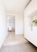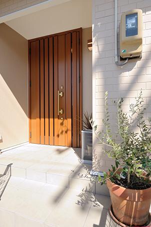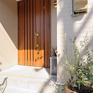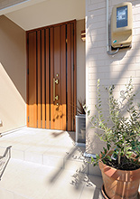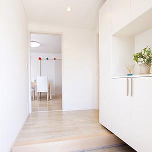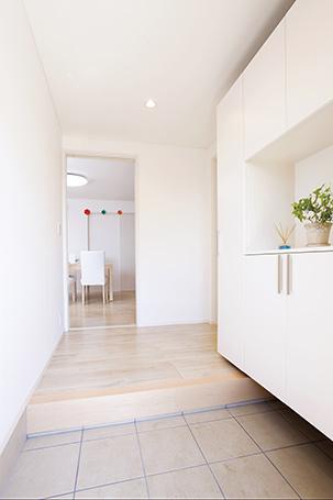 段差が2段あった玄関は、玄関ポーチに段差を移すことで土間部分をフラットに。右面には大容量の玄関収納も。