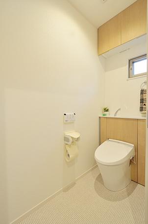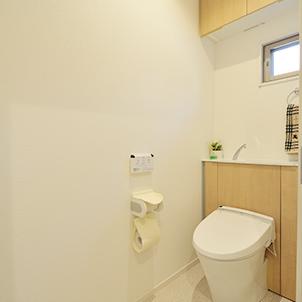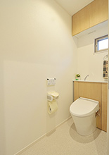 トイレは、便器とタンクの両脇の収納が一体化したエレシャス(LIXIL)。掃除道具やストック用品など収納でき、スッキリお掃除もしやすいです。