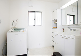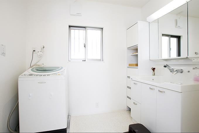 狭かった洗面室は、間取りを変えスペースを拡張。子供たちのお世話もゆったりできます。造作した洗面台横の収納にタオルや洗剤などがたっぷりと収まります。