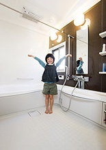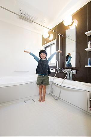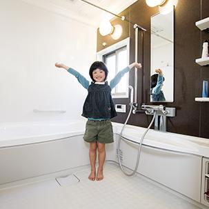 念願だった子供たちと一緒に入れる広いお風呂は、ヤマハのユニットバス(ビュート)。「家族4人で入れるほど広いんです」