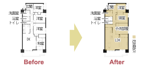 | リフォーム箇所 | リビング、ダイニング、キッチン、洗面室、寝室、子供部屋、玄関ホール |
