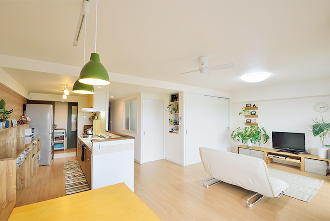 和室とキッチンの壁を取り払い広々ワンルームに。奥様コーディネートのグリーンが並ぶテレビボードはタモ材で造作。中に入れるグレーのボックスや壁の棚はご主人がDIYで作成。