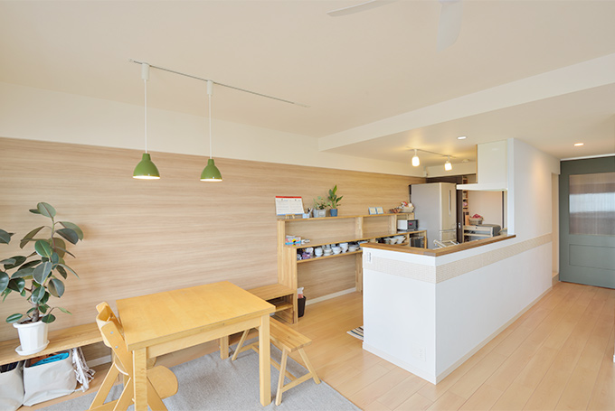 ダイニングのベンチシートはテレビボードと同じタモ材を使用。奥行はキッチン背面収納と統一。壁はグリーンがよく映える木目柄でアクセントに。キッチン腰壁はご主人がモザイクタイルでライン張り。