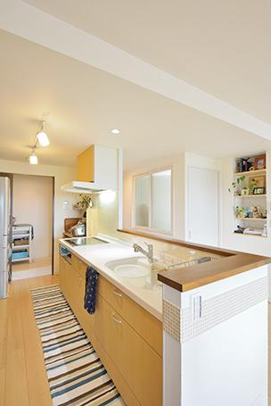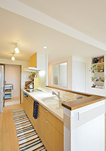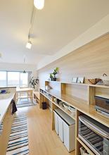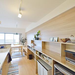 壁付け型からオープンな対面型に。収納家具はメーカー品や既製品にせず木製棚を造作することで、おしゃれなカフェ風キッチンにまとめました。子供部屋の窓から採光が取れるので、自然光だけで一日中明るいです。