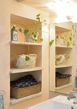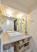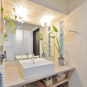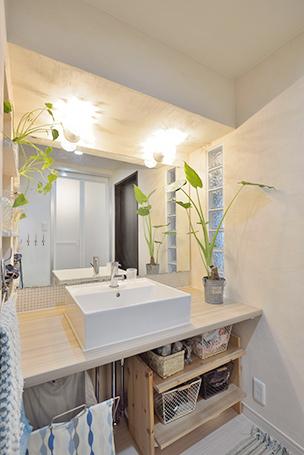 洗面室は木目調のポストフォームカウンターにベッセル式の洗面ボウルでオリジナル洗面化粧台に。壁は湿気を吸ってくれる珪藻土、ニッチ棚とミラー下はモザイクタイルで仕上げ、素朴でナチュラルな空間となりました。アクセントのガラスブロックからは玄関ホールの明かりも注ぎます。