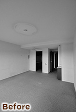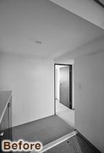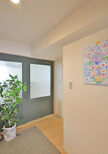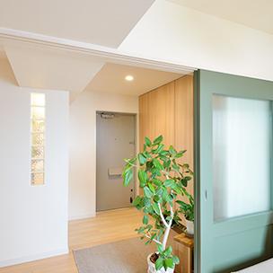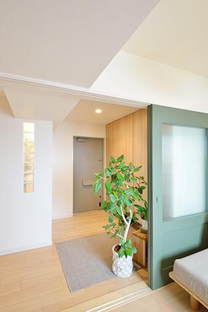 光が取り込めず暗い印象だった玄関は、ガラス部分の大きい2枚引き戸に変えることで採光性がぐんとアップ!隣接する洋室との仕切り戸を30cmほど東に移設することで玄関ホールが広くなりました。