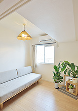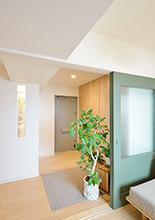 玄関ホール正面にある洋室は、ちょっとした来客時に重宝するゲストルーム。ソファーとグリーンが配され、まるでホテルのロビーのよう。