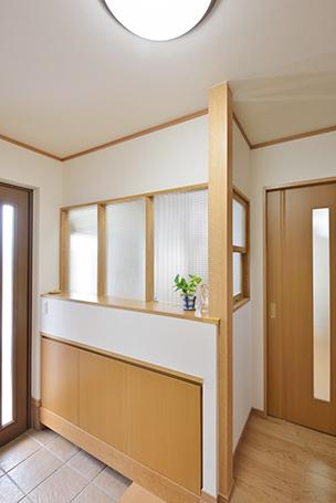 スペースをとっていた玄関ホールは最小限に。勉強スペースとの間に出来た空間は、カバン等が入れられる収納にして活用。