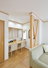 リビングで勉強するのが習慣のご長男のため、玄関ホールの一部を取り込み勉強スペースに。構造用の壁は筋交いを見せることで視界が通り、リビングとの一体感を高めています。ガスの床暖房も設置したので、冬でも部屋は温か。