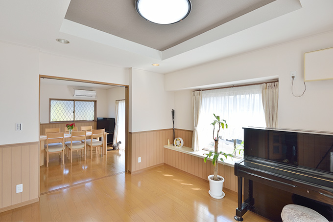 掃き出しサッシの先を増築し、ダイニングスペースに。全ての窓をペアガラスに交換し、断熱性を高めています。ダイニングとは2枚引き戸で仕切ることもでき、冷暖房使用時に便利です。