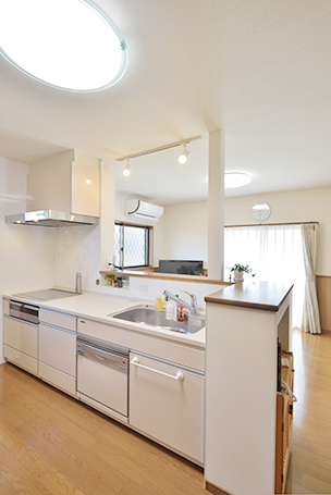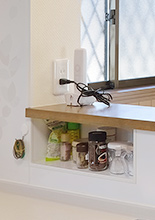 増築で壁付キッチンから明るく視界が広がる対面キッチンへ。カウンター正面はニッチを設け、調味料置きに。システムキッチンはタカラスタンダードのエマージュ。