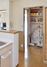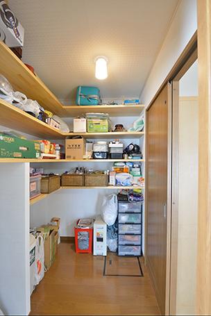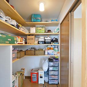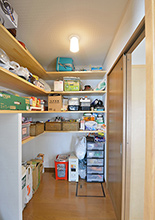 キッチンとリビングの2方向から入れる大容量のパントリー。L型の棚でキッチン用品やストック類、掃除機と何でも収納できるので、「LDKが片付いて管理も楽です。」とN様。