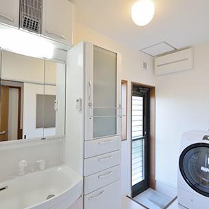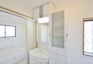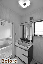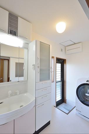 収納不足だった洗面室は、化粧台の隣に天井までのトール収納を配し、上部には換気扇も新たに設置。明るく清潔感のある洗面室です。