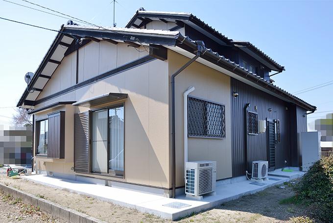 増築に伴い外壁を明るい色に塗装。傷んでいた雨樋や玄関ポーチのタイルは新しく取替え、雨戸戸箱は板金張り。アクセントになりました。