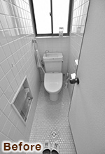 以前は壁も床もタイルのため、お掃除が大変だったトイレ。床はクッションフロアに、壁は下部は腰パネル、上部はクロスにすることで、お掃除がしやすいトイレに。