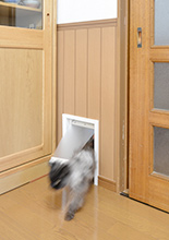 玄関からリビングに入るドア横に専用のペットドアを設置。ガリガリしやすい腰から下の壁は腰板を張って強化。